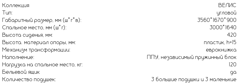Идеальное сочетание комфорта, стиля и функциональности. Одно из главных достоинств — его конструкция: удобная еврокнижка, которая позволяет превратить его в полноценную кровать. Надежность, удобство и функциональность — все это делает диван ВЕЛИС идеальным выбором для вашего дома.