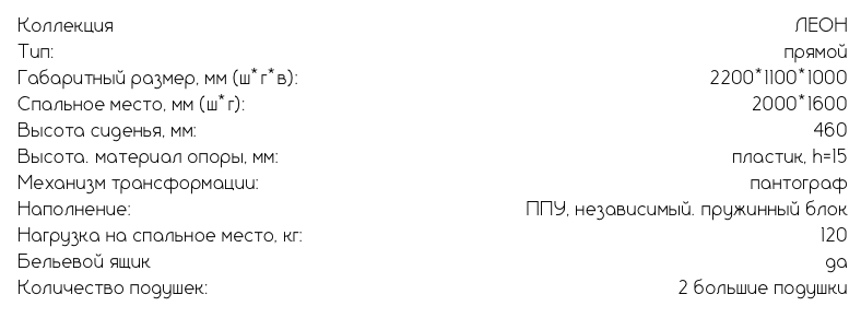 Модель оснащена двумя вместительными коробами для хранения размером 94 × 58 × 25 см, в которых удобно размещать постельное бельё, пледы и другие необходимые вещи. Мягкая обивка, комфортная посадка, высокая спинка и закруглённые подлокотники делают «Леон» идеальным местом для отдыха. Каркас выполнен из прочных материалов, а в качестве наполнителя используется независимый пружинный блок H80 — он обеспечивает оптимальную жёсткость, хорошо держит форму и рассчитан на длительную эксплуатацию.