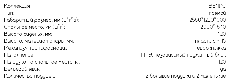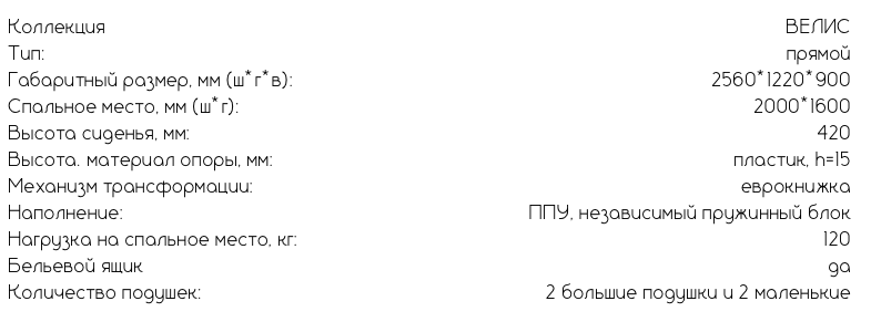 Идеальное сочетание комфорта, стиля и функциональности. Одно из главных достоинств — его конструкция: удобная еврокнижка, которая позволяет превратить его в полноценную кровать. Надежность, удобство и функциональность — все это делает диван ВЕЛИС идеальным выбором для вашего дома.