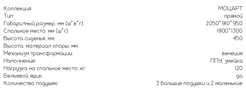Отсутствие подлокотников позволяет вписать его даже в небольшие комнатные пространства, не перегружая интерьер. Средняя степень жесткости модели способствует долгому сохранению четких линий, не позволяя дивану деформироваться.