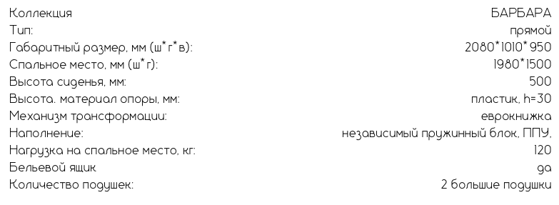 Барбара – это идеальное сочетание надёжности, простоты и комфорта. Прямая строчка на сиденье и приспинных подушках создает завершённый образ и придает модели мягкую геометричность. Механизм «Еврокнижка» в сложенном виде поможет сэкономить пространство в комнате и использовать диван для ежедневного сна. Компактный подлокотник позволит разместить диван как небольшой кухне-гостиной, так и в молодежной комнате. Благодаря универсальному дизайну, качественным материалам и эргономичности диван станет главным местом гостиной в современном стиле, сканди или лофт.