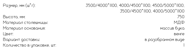 Размеры столешниц: 3500/4000*1100, 4000/4500*1100, 4500/5000*1100, 3500/4500*1100, 4000/5000*1100